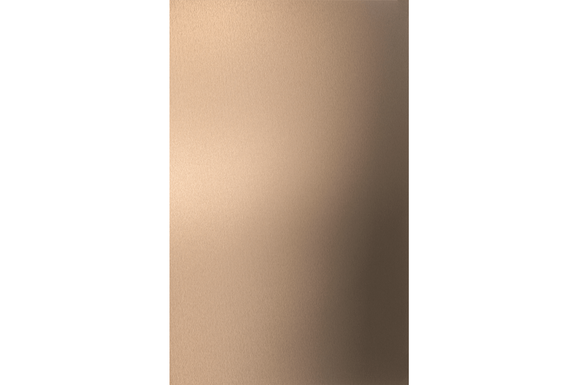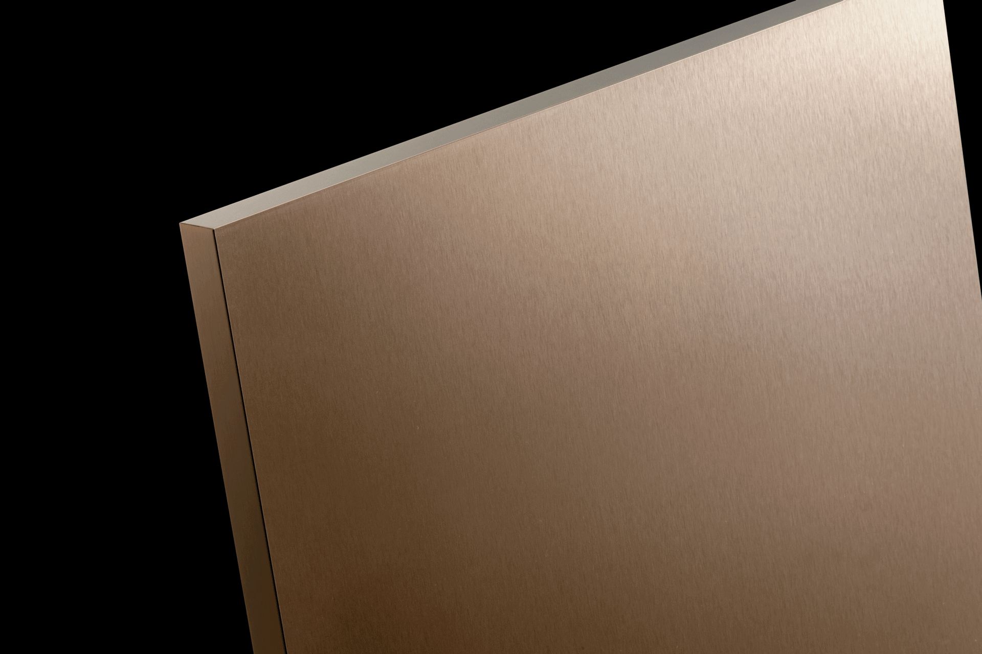 Ante realizzate con pannelli MDF rivestiti in foglia PET metallizzato, retro melaminico in tinta, bordatura in Abs con colla poliuretanica.